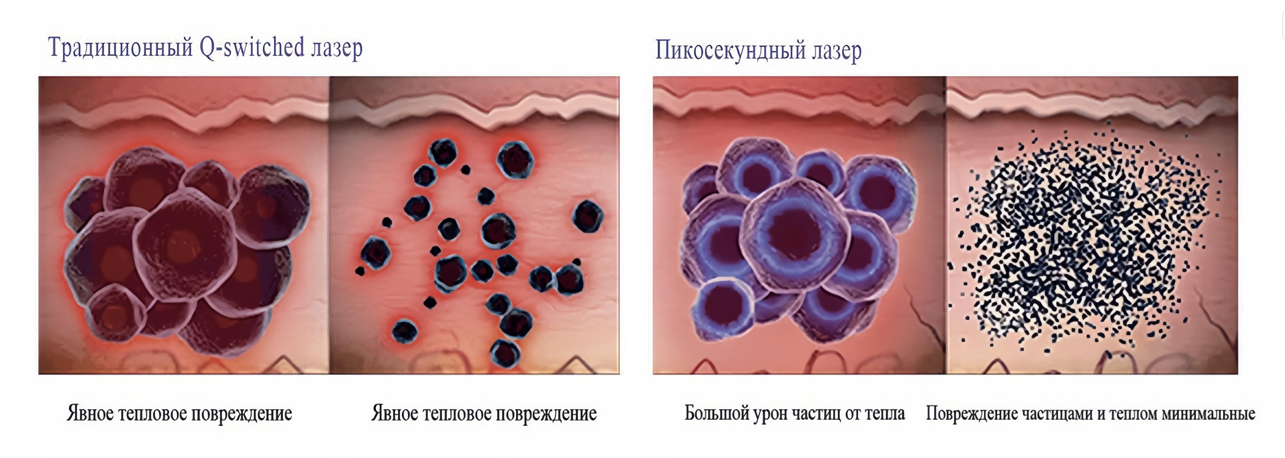 Пикосекундый лазер принимает фотоакустический эффект. С помощью регулировки пиковой мощности лазера и времени воздействия(ширина импульса=ps) выполняется взрыв хромофора(татуировки, различного рода пигментация)