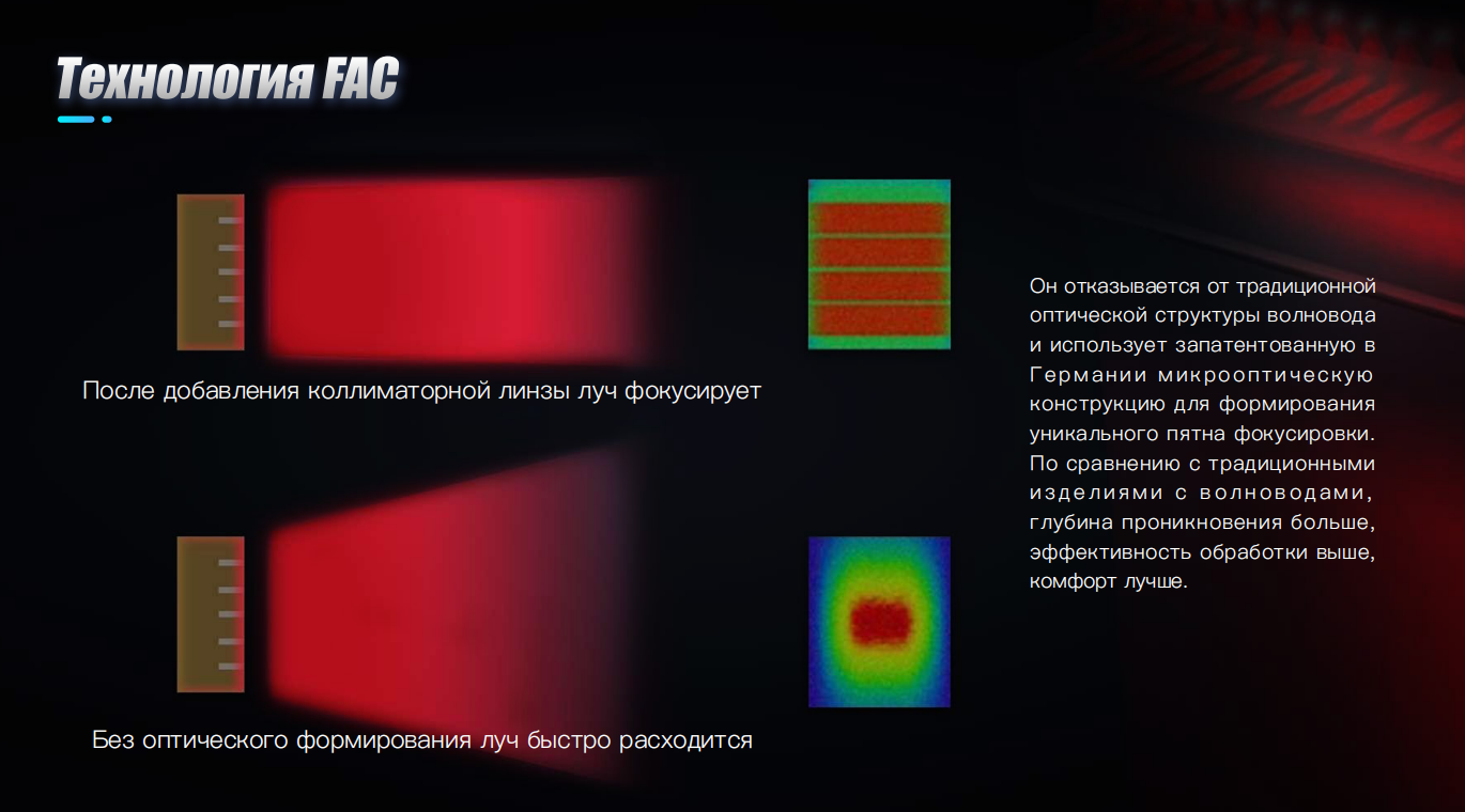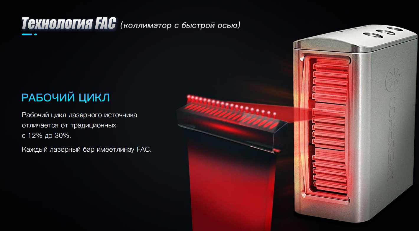 Новая технология FAC (коллиматор с быстрой осью) Каждый лазерный бар имеет линзу FAC и после добавления коллиматорной линзы луч фокусирует и намного эффективный . Без оптического формирования луч быстро расходится